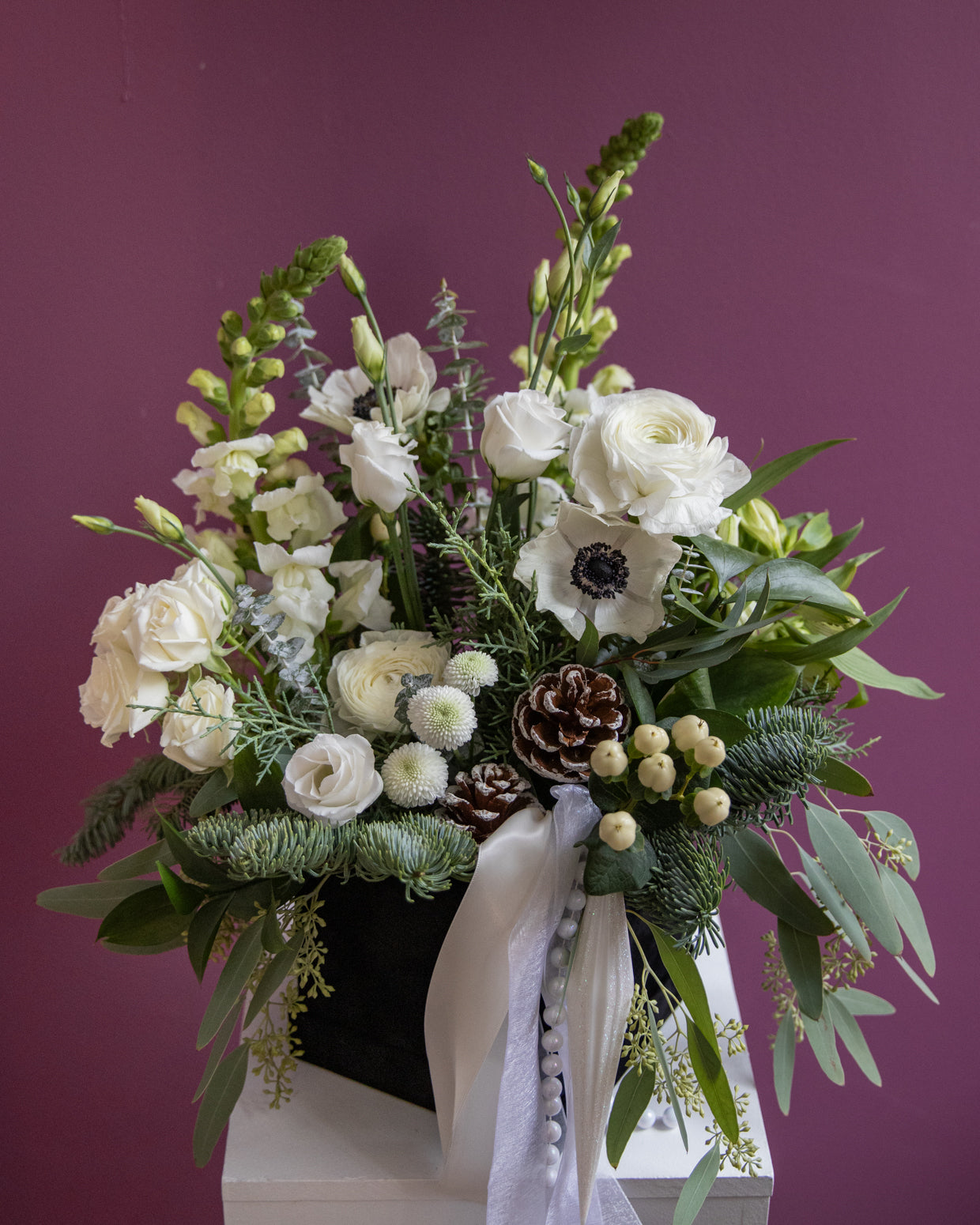 This elegant Arrangement of white and green flowers in a lux Black Velvet Hat Box bring elegance to every room.