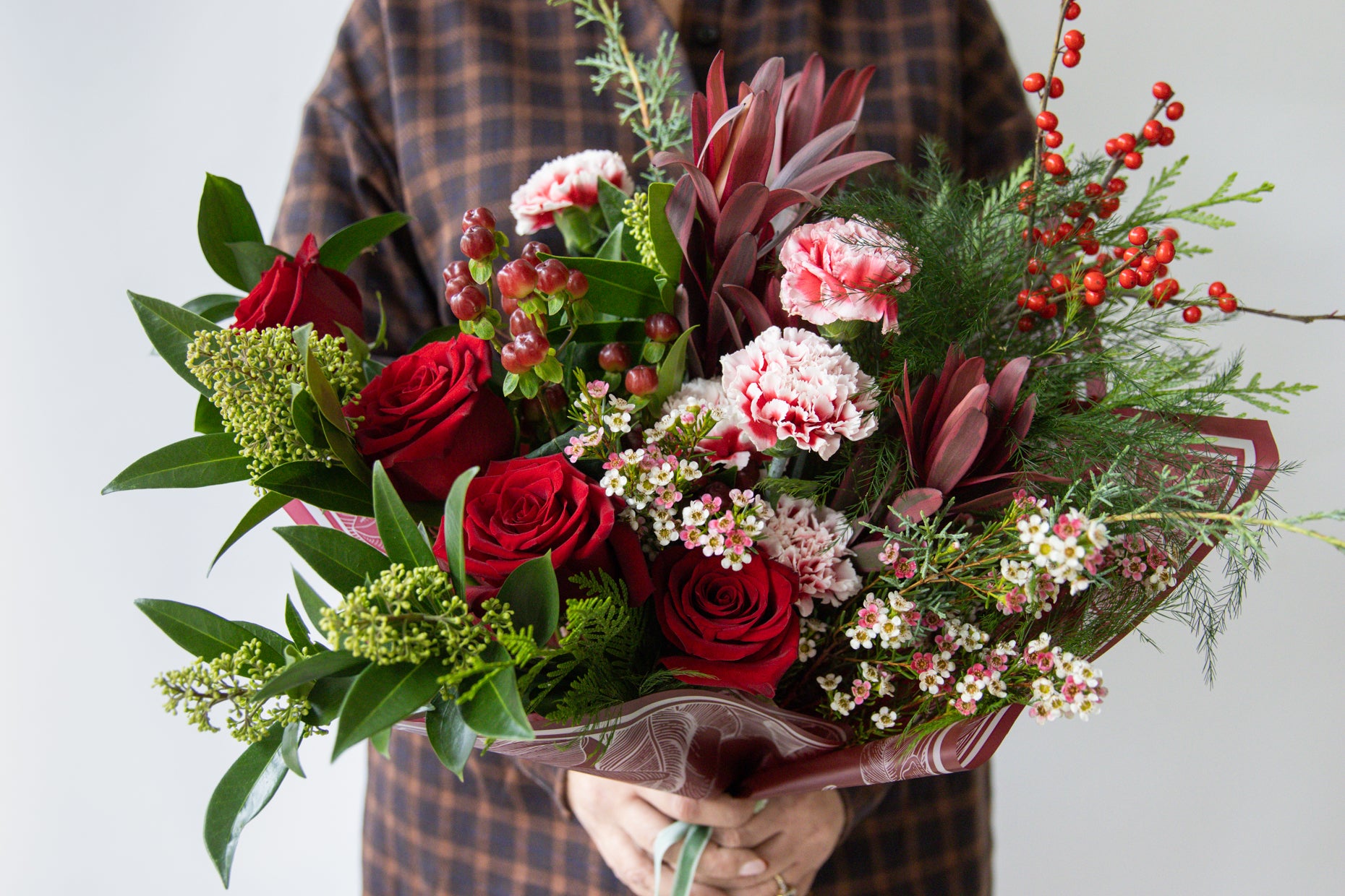 A collection of stunning florals in shades of reds all handtied and wrapped in premium paper with ribbon. Features Red Roses, Red Carnations and Berries.