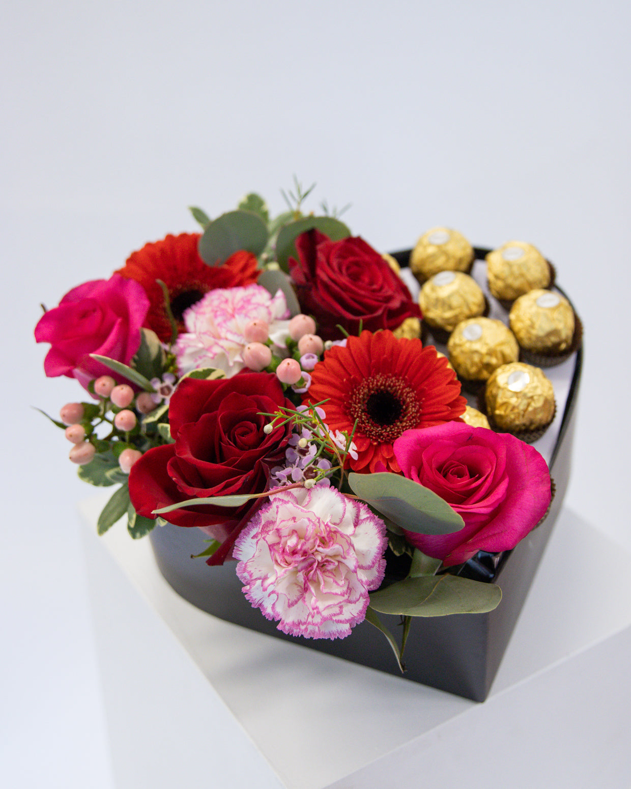 A collection of flowers and chocolate the perfect gift for your Valentine. Designed in a lux black heart shaped hat box. Choose your chocolate selection below. Approximately 10-11 chocolates in the box!